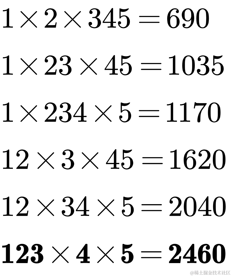 例如十进制整数 12345 划分为 3 段可有如下情形:
