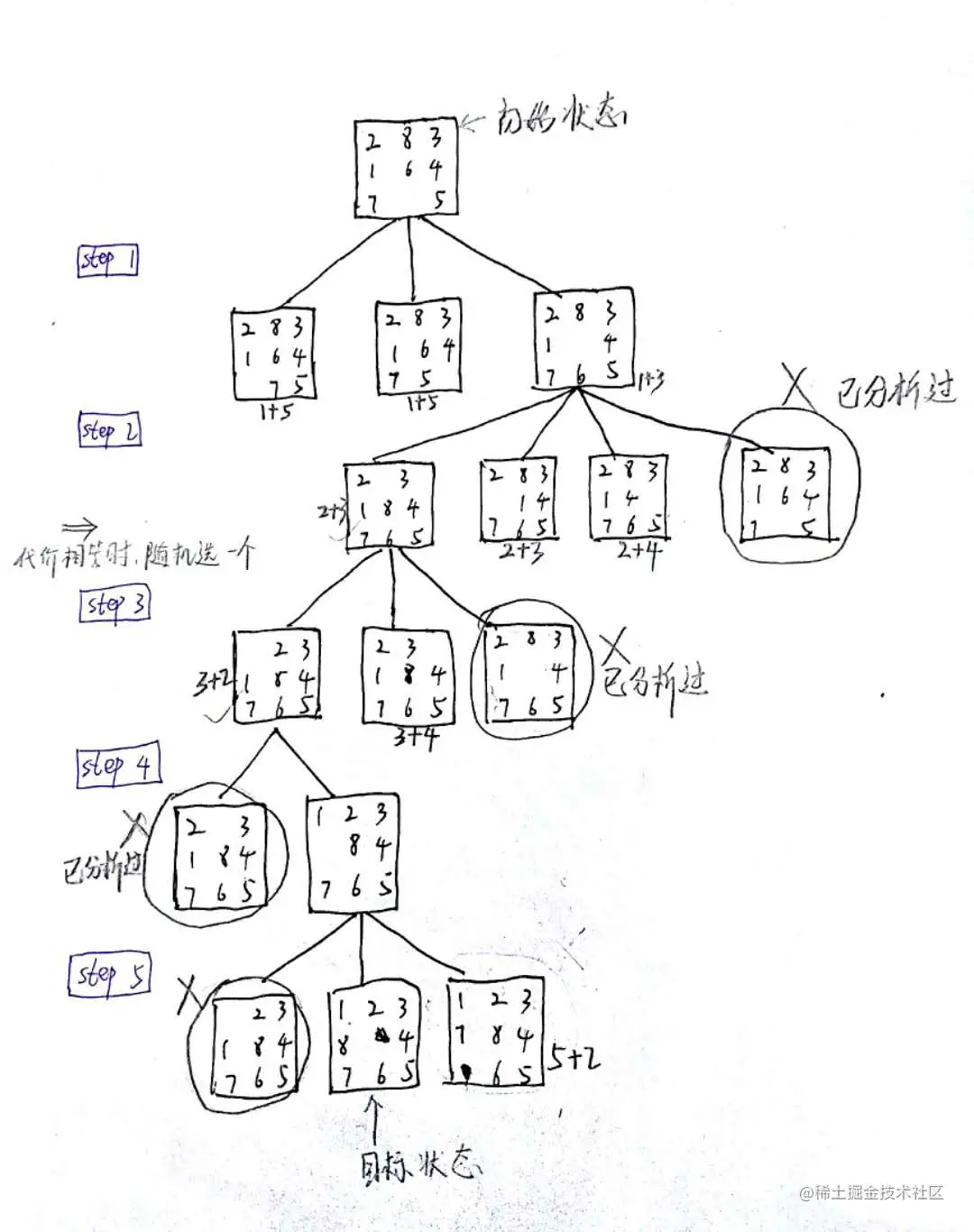有一个需要注意的地方:因为有 “代价相同时随机选择一个方向” 和 “只能处理先前未处理过的状态” 这两个要求。所以对于某些棋盘的最终步数,甚至是是否有可行解有很大影响。