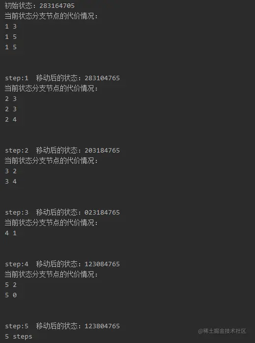 程序修改的方法就是在探索方向的for循环里顺便计算四个(最多四个)子方向的代价值,选择一个代价最小的方向作为最终的方向final去让空白格移动。然后判断新状态是否已分析,若没有,则进行原始的操作;若已经处理过了,则跳过。当然,这个过程要换到for循环外面。同时,因为选择的方向已经是最优的,所以操作以后不需要让空白格回退 。