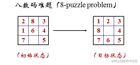 3×3 九宫棋盘,放置数码为1 -8的8个棋牌,剩下一个空格。指定初始状态和目标状态,要求只能通过移动空白格来形成指定棋盘。求最短步数以及移动方法。