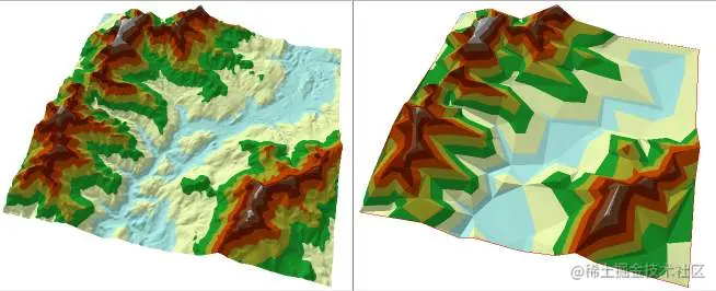 早年,地理的三维还处于地形三维上,即数字高程模型(DEM)提供地表的高度拉伸。栅格高程数据、等高线、不规则三角网等均是数字高程模型的具体案例。