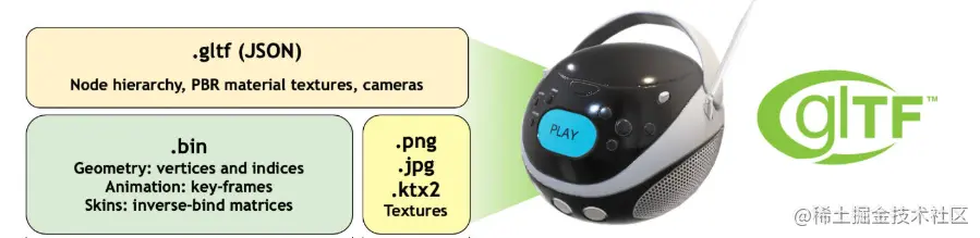 glTF 也是一种规范,它的数据文件不一定就是后缀名为 .gltf 的文件,也不一定只有一个文件(glTF 的文件还可以是二进制文件、纹理贴图文件等,扯远了哈)。
