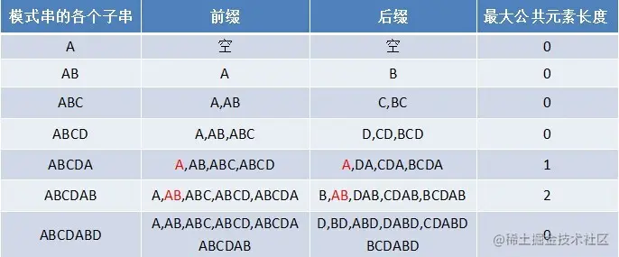 - 部分匹配值:前缀和后缀的最大公共元素长度。