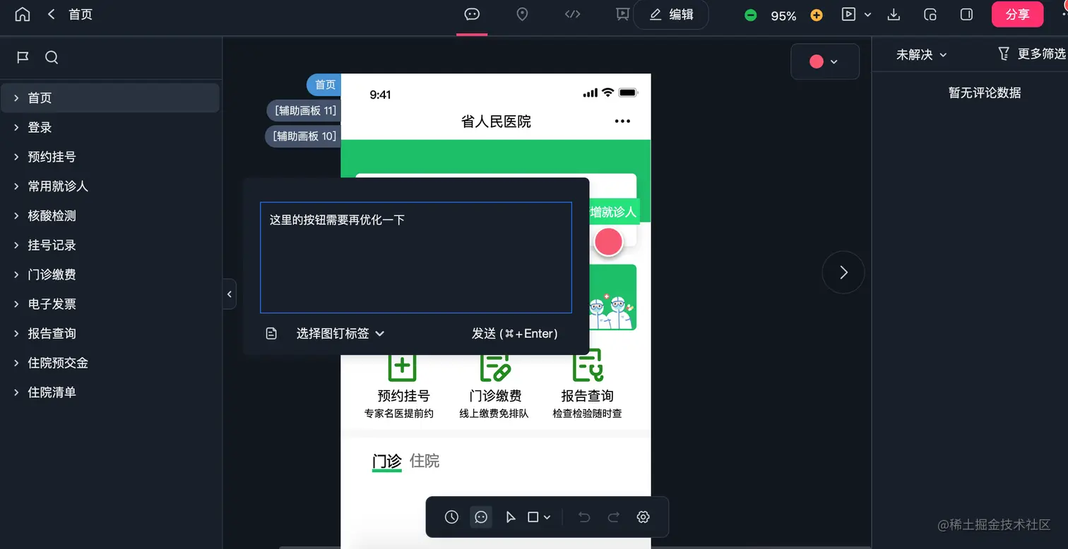 导出和共享原型,也可以直接发布到设计协作平台摹客CC,团队成员可以直接打点评论原型。