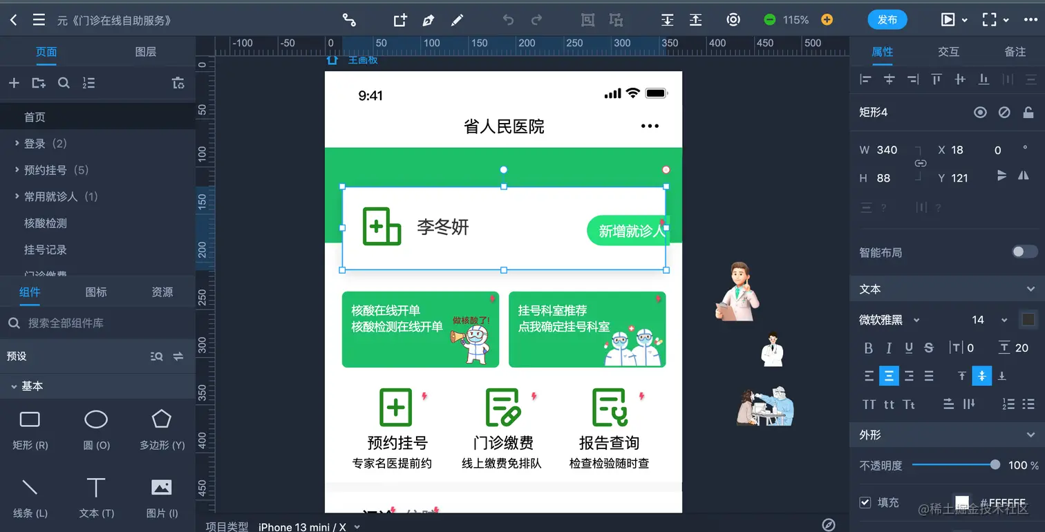 这是一款医院患者自助服务的H5原型模板,主要为医院挂号预约,报告查询、电子发票、核酸检测、住院服务等功能。本套原型将得到H5效果进行了高保真还原,添加了各页面之间的必要的跳转,还原真实使用效果。整套风格简约,页面整洁,全部采用了RP的原生组件和图标。
