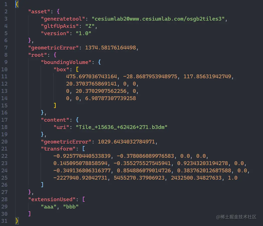 现在,我们先认识一下,描述整个 3dTiles 数据集的入口文件,也叫做三维瓦片数据集 —— tileset.json: