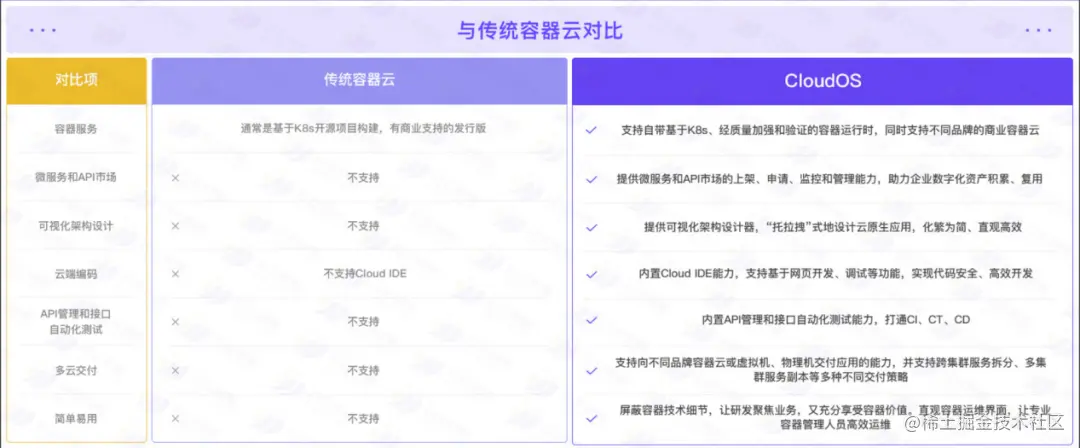 相比于传统的容器云平台,CloudOS有着更为全面的优势以及满足一站式开发的功能,如下图所示: