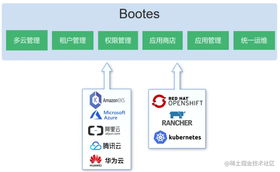 为解决上述多云架构带来的问题,上汽乘用车采用了基于CloudOS包含的Bootes(云原生混合云管平台)产品: