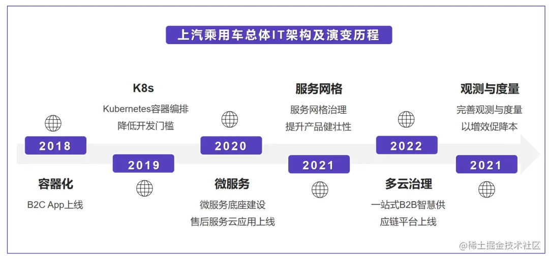 早在2018年,上汽乘用车就开始了微服务与服务网格等技术的试点应用。2020到2021年期间,微服务的应用快速增长,在全企业范围内快速推广,全面覆盖上汽乘用车的研发、制造、营销等业务。2022到2023年期间,上汽乘用车已经实现了微服务应用的全面治理,各项应用稳定运行。
