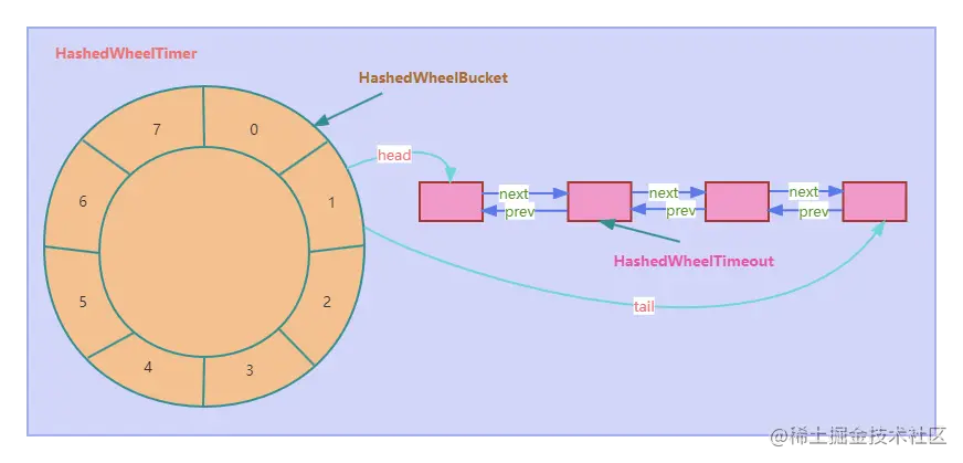 时间轮算法用的是一个环形的数据结构(使用数组实现),每一轮相当于沿着环形走一圈,类似于钟表,可以分成很多格子(秒针一圈分成60格,算法中叫bucket,这个bucket里可以存放任务),然后每个格子有持续的时间间隔(比如秒针一个格子是1秒,也就是走过这一格持续1秒的时间,算法中对应的是tickDuration)。
