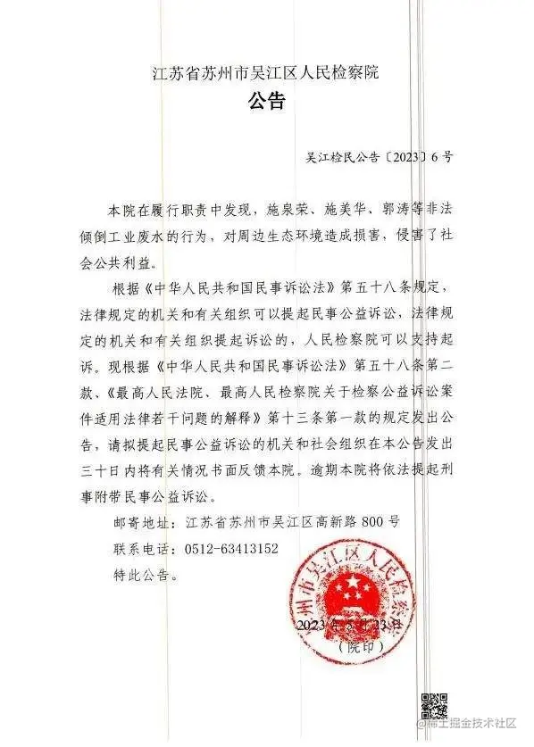公告显示,苏州市吴江区人民检察院在履职中发现,施泉荣、施美华、郭涛等非法倾倒工业废水的行为,对周边生态环境造成损害,侵害了社会公共利益。