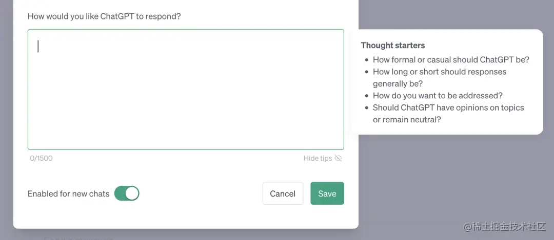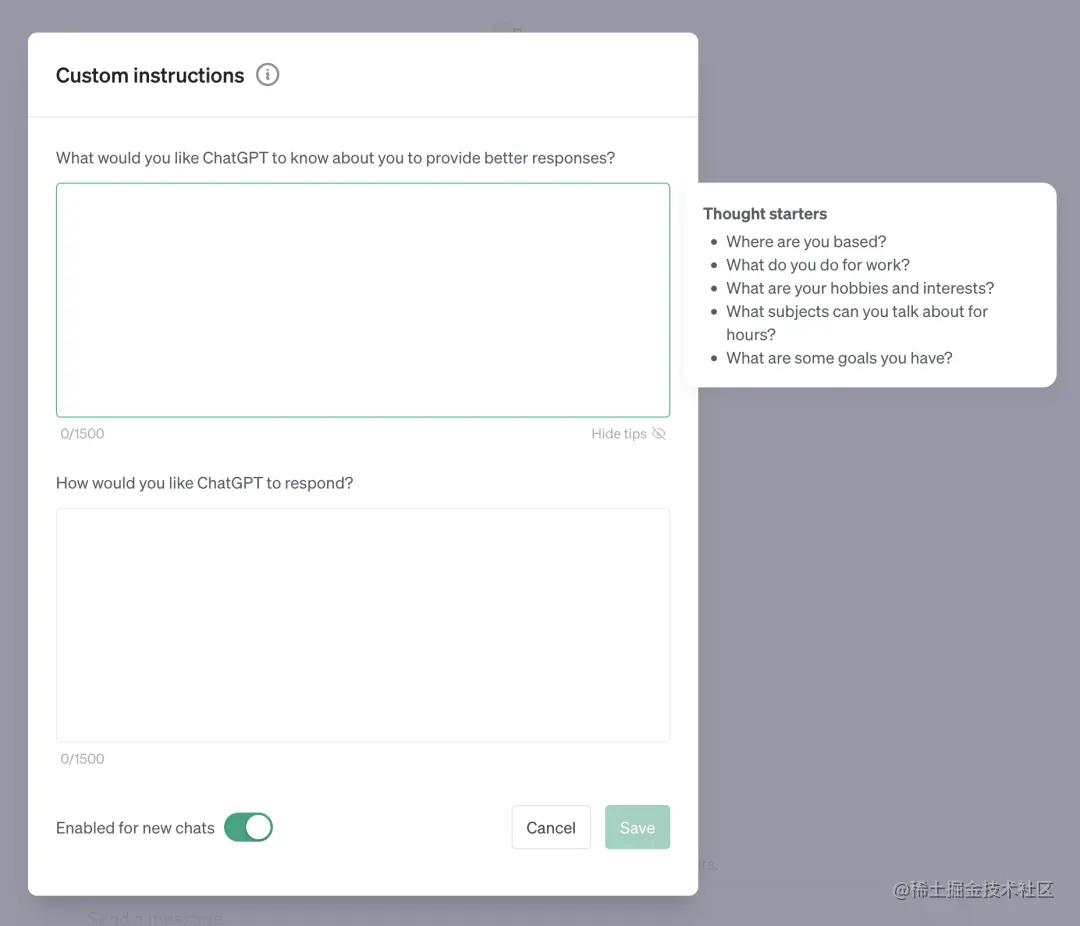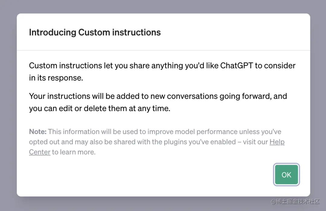 各位好,美国时间7月20号OpenAI给ChatGPT做了一个小迭代,加入了custom instructions(自定义指令)功能,我第一时间看了下这个功能介绍,简单来说就是官方研究了多个国家和地区的使用情况,大家用的五花八门,我们官方也学到了不少,所以ChatGPT将在今后的每次对话中考虑您的自定义指令。模型每次回复时都会考虑这些指令,因此您不必在每次对话中都重复您的偏好或信息。我也第一时间开通了这个功能试用了一下,具体操作如下: