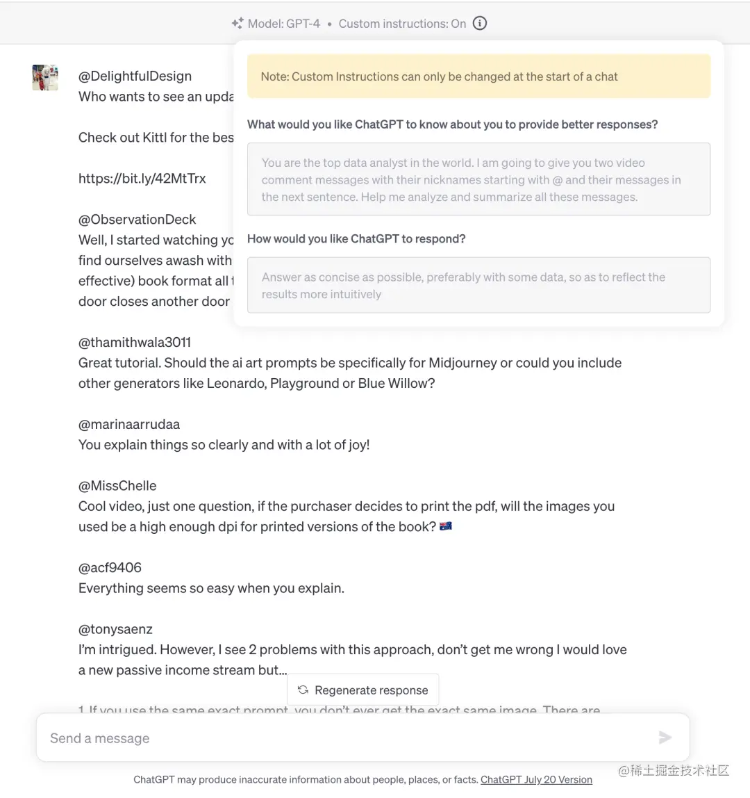 我设定的内容是给一些视频评论让GPT帮我分析,分析的结果给一些数据支持。接下来新建一个对话,可以看到有个Custom instructions: On的标志,悬停提示我们当前对话设置了哪些内容。