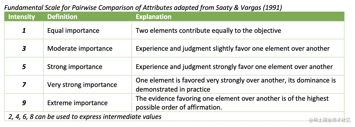 AHP uses both qualitative and quantitative criteria for classification and requires subjective judgement to rank relative importance of elements into numeric value.