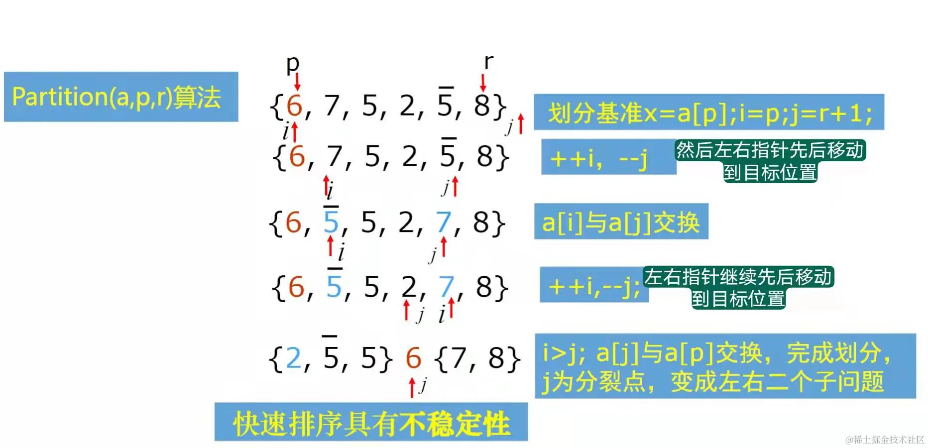 快排最重要的就是Partition函数,网上的版本有很多,虽说结果一致但步骤不尽相同。下面的是我最喜欢的一种方式: