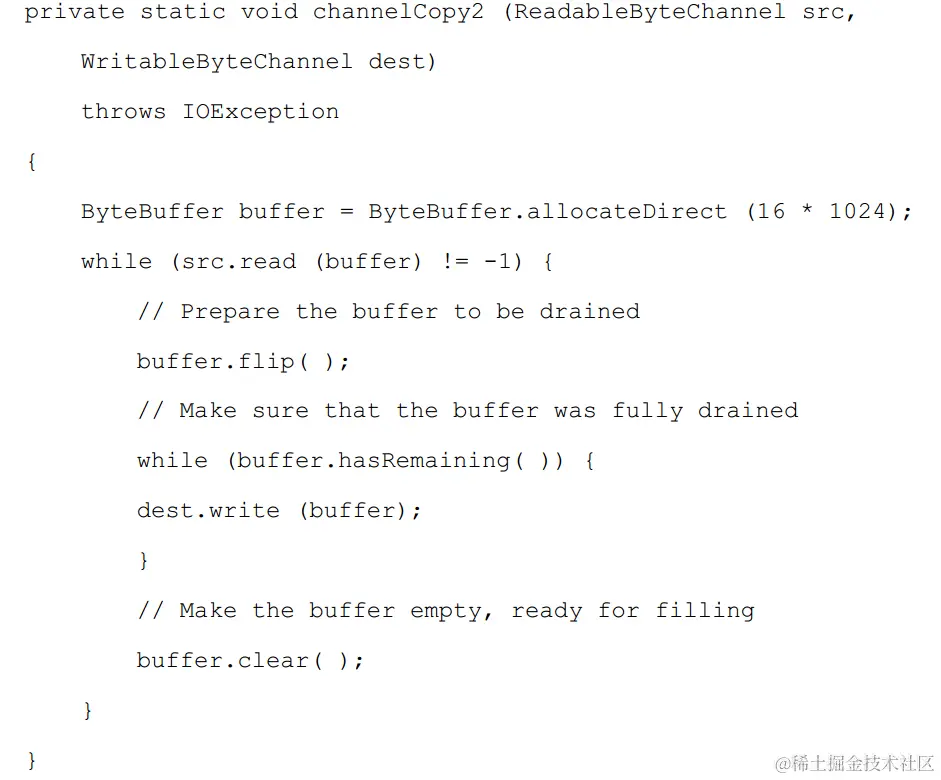 ByteChannel 的read()和write()方法是用ByteBuffer作为参数,返回已传输的字节数,比缓冲区的字节数少或者可能为0,因为一次输出不完,缓冲去的位置会与已传输字节相同数量的前移,如果只进行了部分传输,缓冲区可以被重新提交给通道,并从上次中断的地方继续传输(基于Buffer的positon属性,继续操作postion到limit的数据)。该过程重复进行,直到Buffer.hasRemaining()方法返回false:如下: