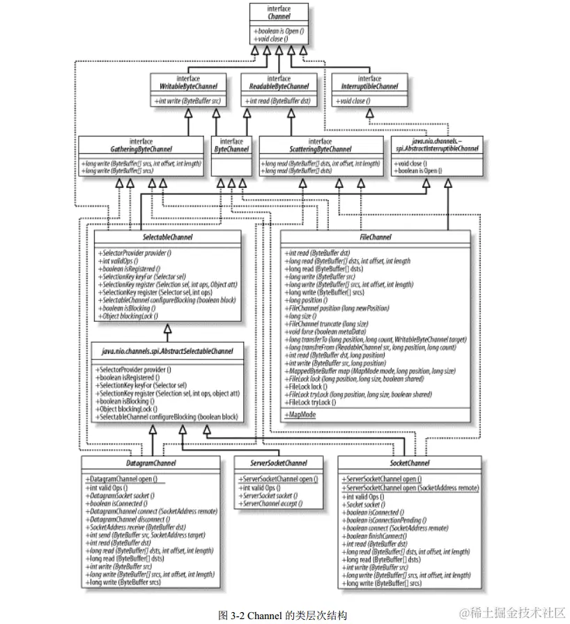 File IO、Stream IO 《==》通道两大类:FileChannel(文件通道)、SocketChannel-ServerSocketChannel-DatagramChannel(套接字通道)。