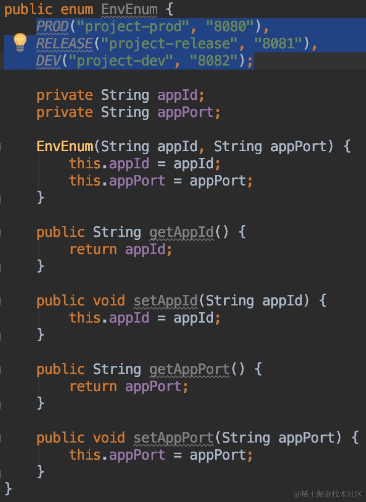 枚举实例将所有的关联特性包装在一起,更适合此种情景应用,如:(EnvEnum.PROD.getAppId()、EnvEnum.PROD.getAppPort())