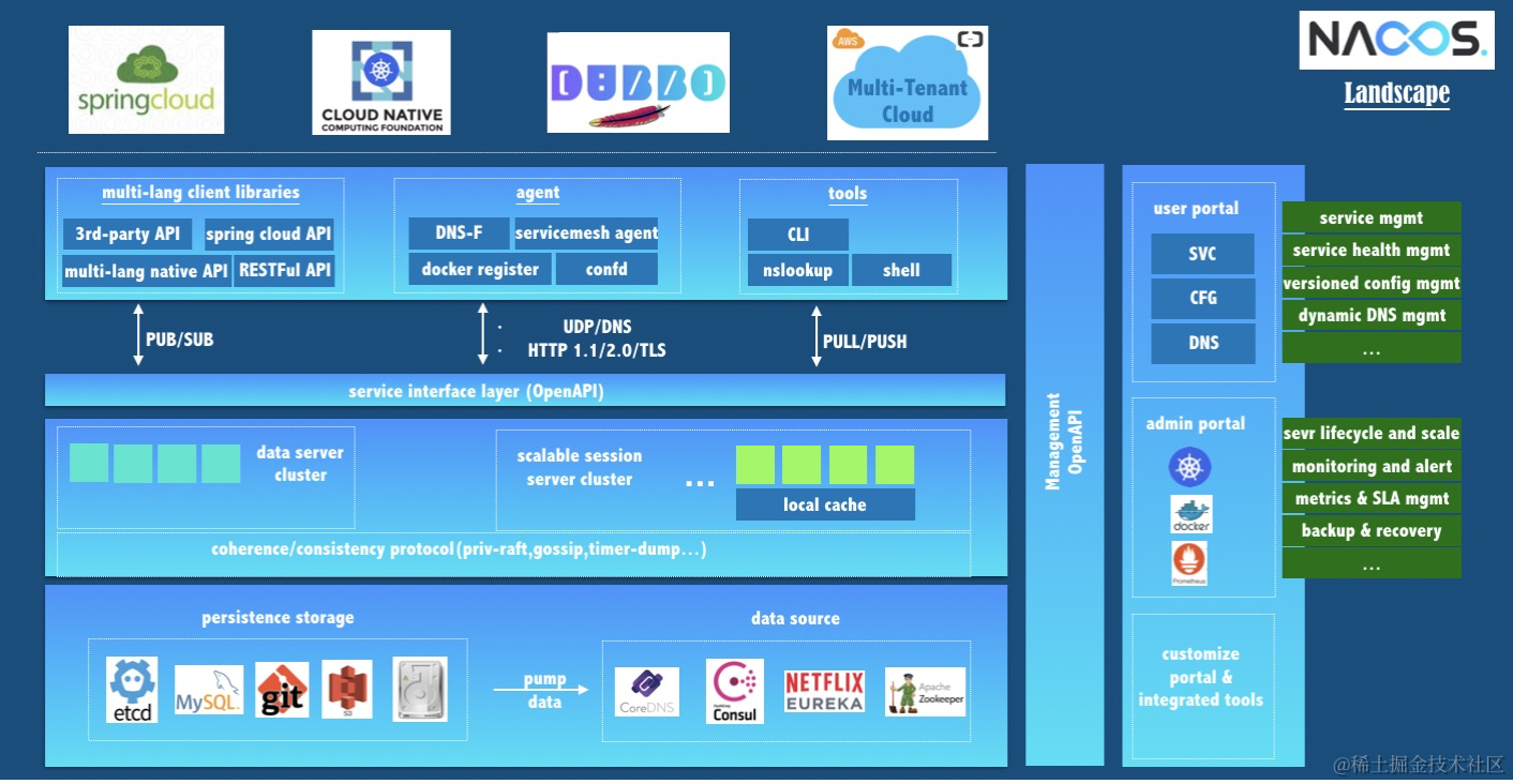 Nacos 支持对服务及元数据的管理。包括服务定义,生命周期,服务静态依赖分析,健康状态,流控,路由,安全规则,SLA及metric监控等。