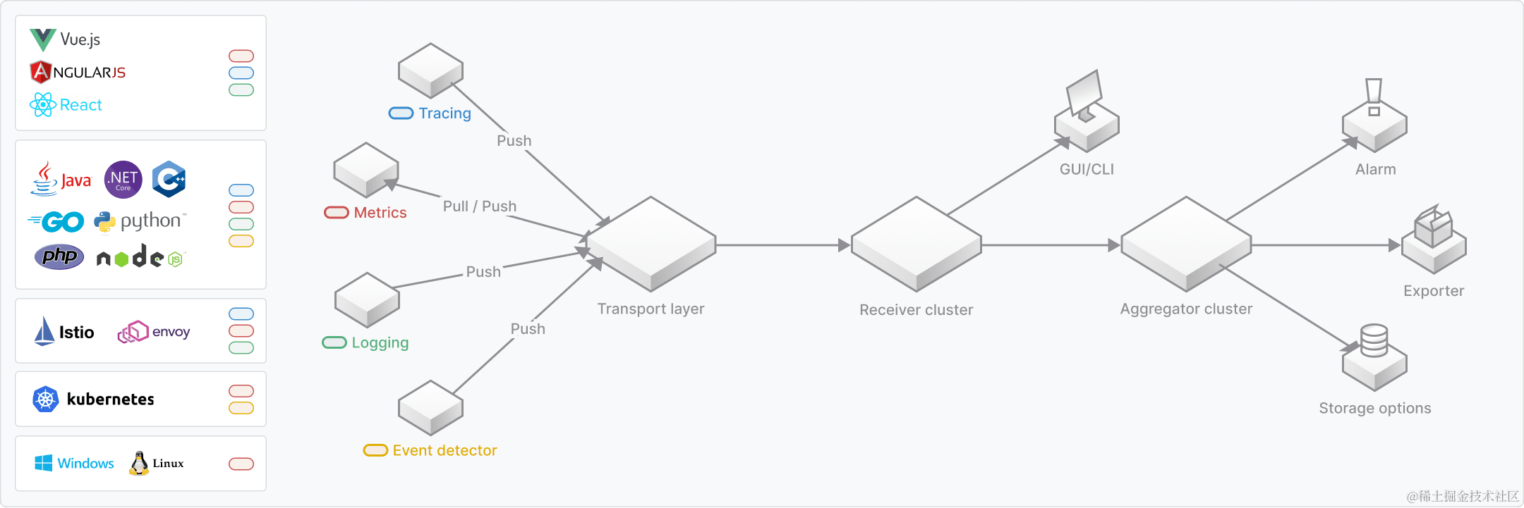 开源系统监控报警系统。负责收集,存储时间序列监控数据并展示。整体架构图如下: