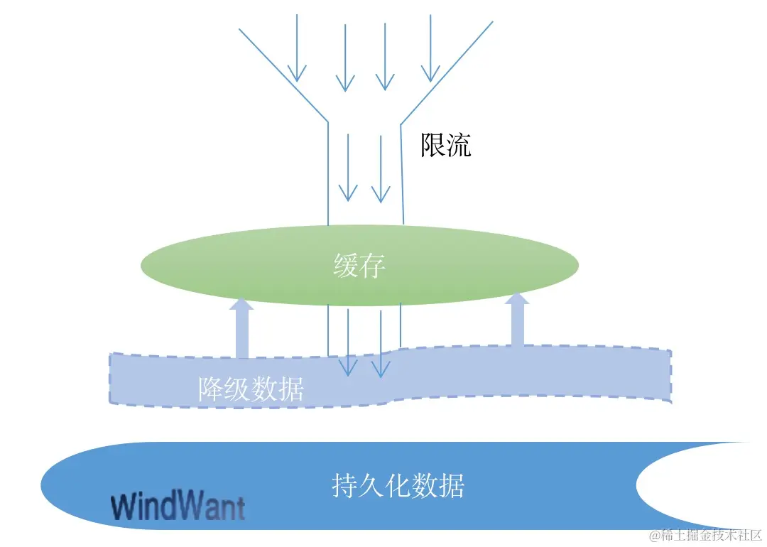 缓存、持久化数据存储都是资源,或者我们可以从对缓存的流控及对持久化数据存储的熔断、降级保护来着手应对缓存雪崩的情景发生。