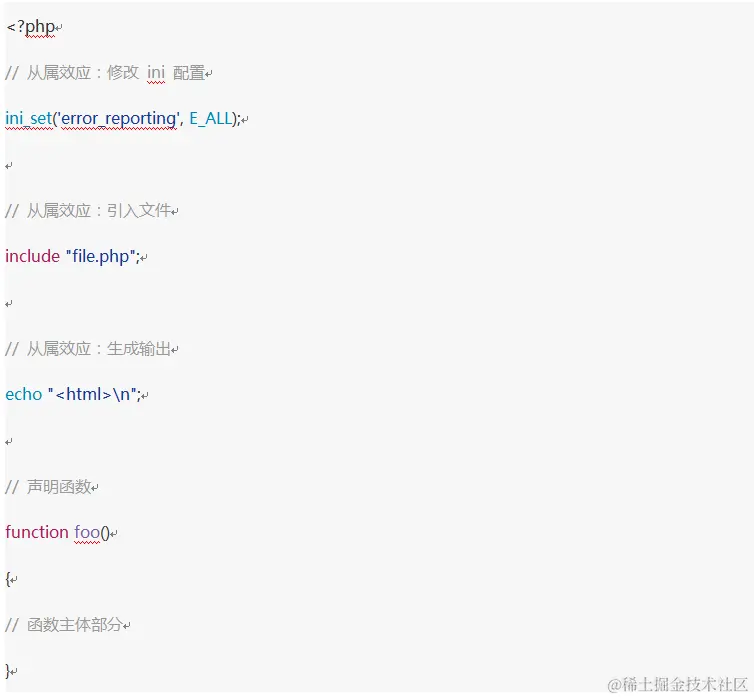 “从属效应”包含却不仅限于:生成输出、直接的 require 或 include、连接外部服务、修改 ini 配置、抛出错误或异常、修改全局或静态变量、读或写文件等。