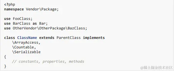 根据规范,每个类都独立为一个文件,且命名空间至少有一个层次:顶级的组织名称(vendor name)。
