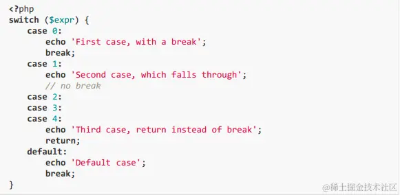 标准的 switch 结构如下代码所示,留意括号、空格以及花括号的位置。 case 语句必须相对 switch 进行一次缩进,而break 语句以及 case 内的其它语句都必须相对 case 进行一次缩进。如果存在非空的 case 直穿语句,主体里必须有类似 // no break 的注释。