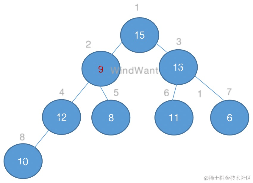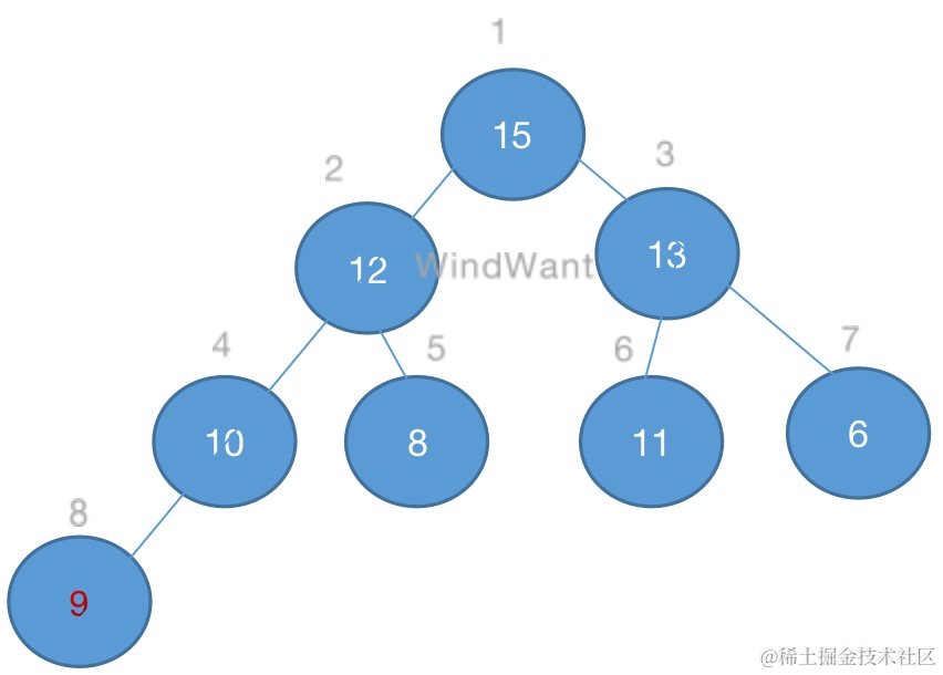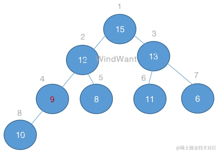 如下图,堆中元素9的维护过程: