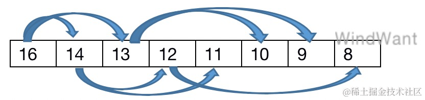 以数组 {27,17,3,16,13,10,1,5,7,12,4,8,9,0} 为例进行堆构建,结果为:{27,17,10,16,13,9,1,5,7,12,4,8,3,0}