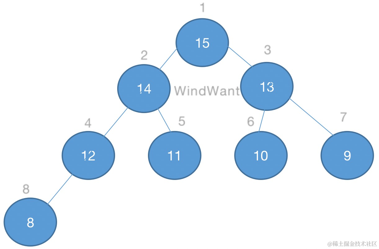 对于节点 i,则其父节点为 (i - 1)/2,左子节点下标为 2i + 1,右子节点下标 2i + 2。