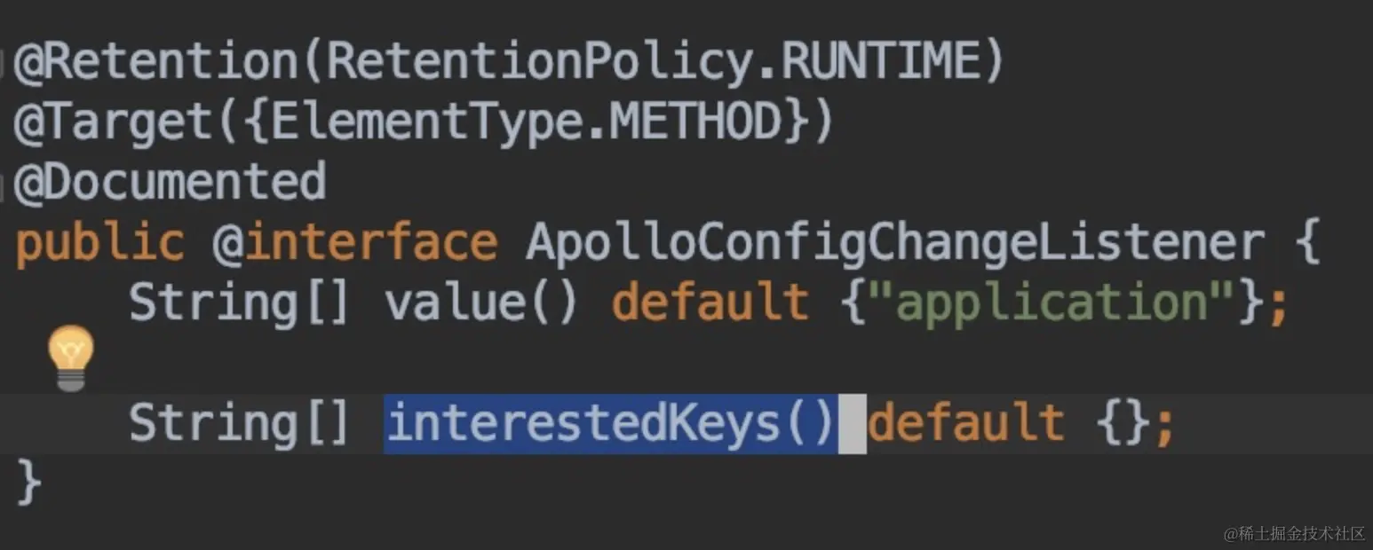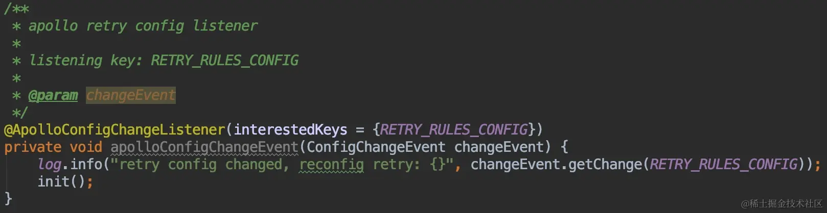 @ApolloConfigChangeListener(interestedKeys = {RETRY_RULES_CONFIG})