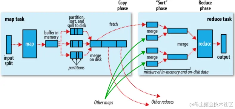 - map 任务输出会做相应的排序处理,并作为 reduce 任务输入;