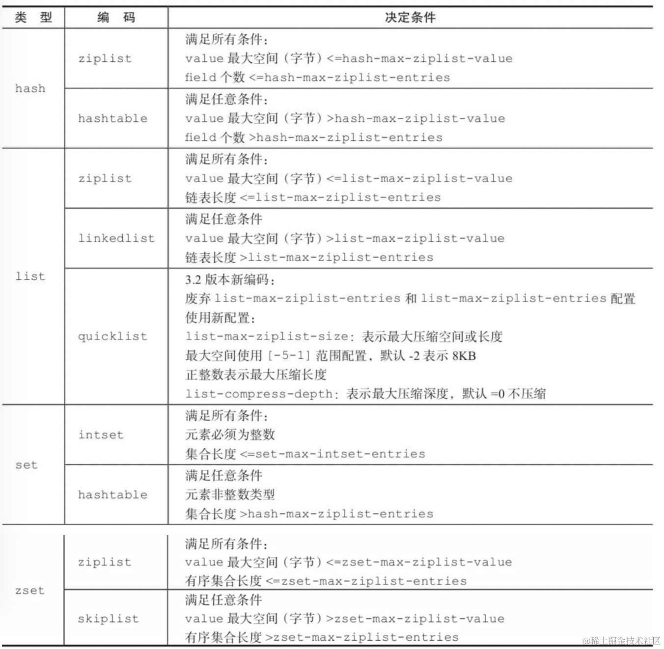 配置:hash-max-ziplist-entries(hash类型最大kv数据,默认512)、hash-max-ziplist-value(单个v值最大值, 默认64)