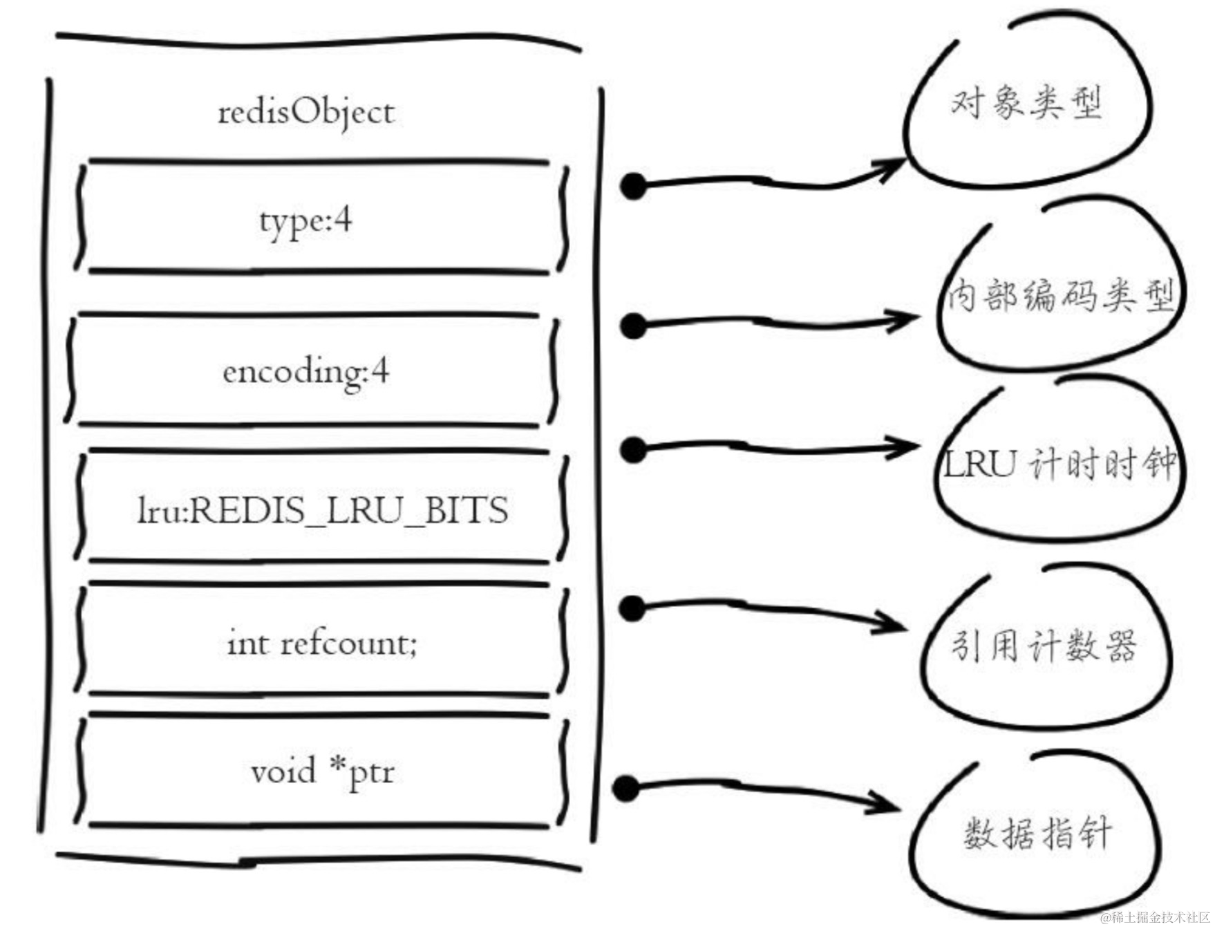 5、 *ptr:数据存储或指向,数据本身或者指向数据的指针,redis3.0之后,长度在39以内的字符串数据,内部编码为embstr,内存创建时,字符串和redisObject一起分配,减少一次内存分配。