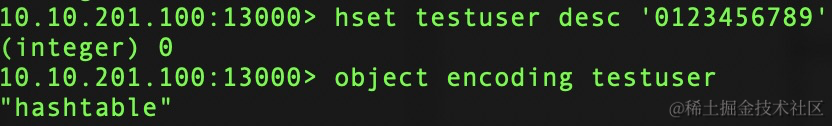 示例:添加 testuser hash类型key,先后设置元素name、desc不同长度元素值,分别查看内部编码类型