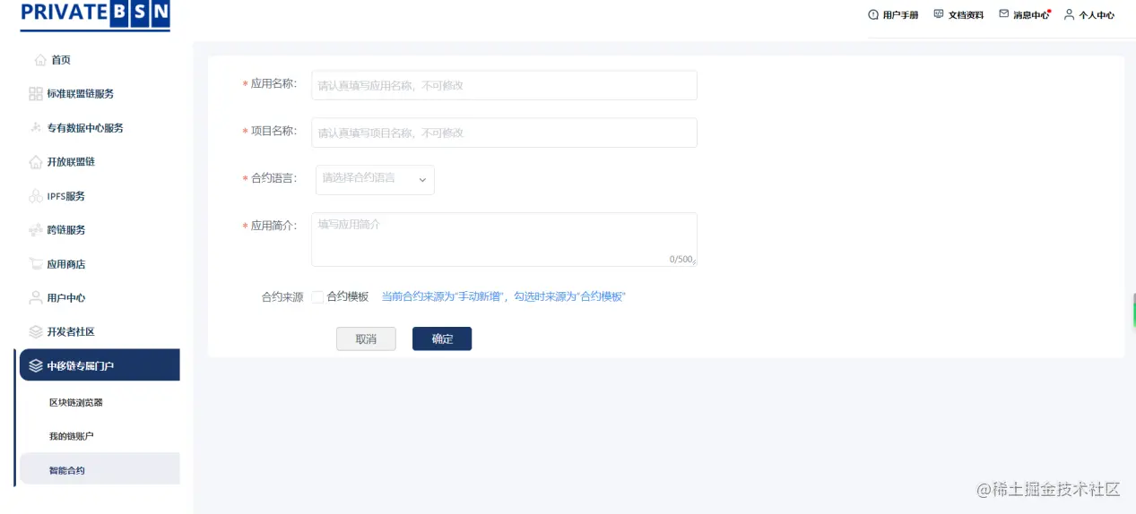 在BSN分布式云管平台门户中,用户可以选择在中移链专属门户上创建智能合约,以实现供应链管理、溯源、存证等各种应用场景。