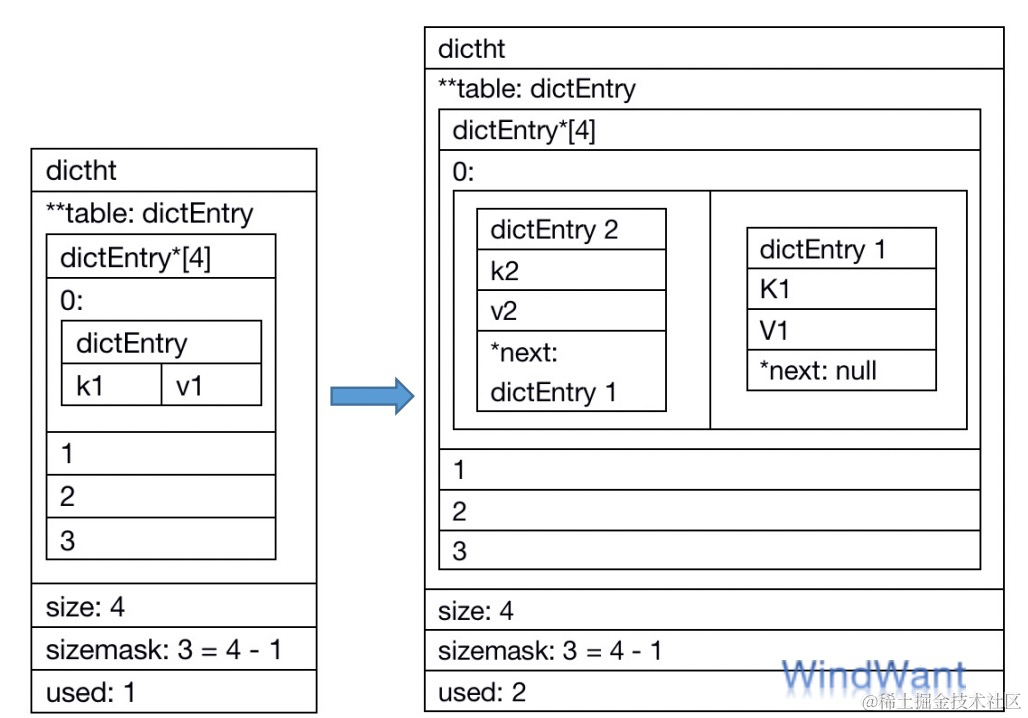 上面第二节我们介绍过 dictEntry 的结构,其中包含一个指向另一个节点的指针 next。