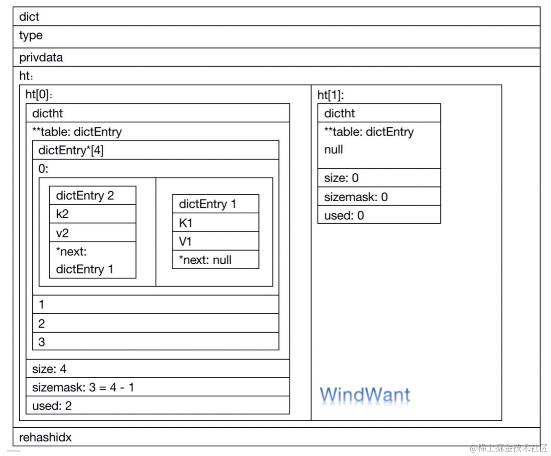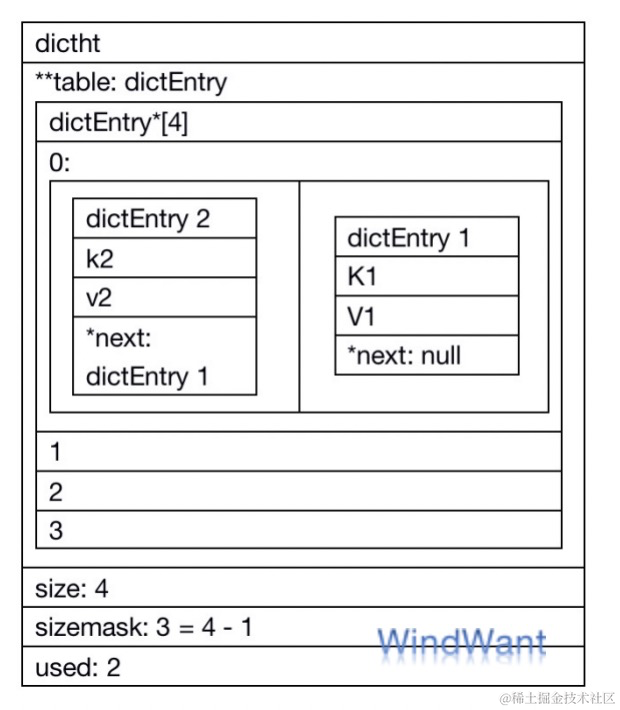 如下,哈希表容量 size 为 4,掩码 sizemask 为 3 ,内部存储了两个键值对(k1、v1)、(k2、v2),已使用容量 used 为 2: