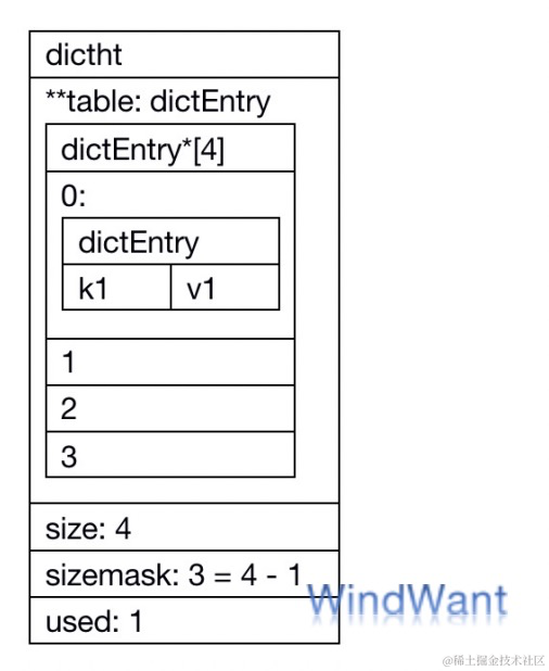 如下,哈希表容量 size 为 4,掩码 sizemask 为 3 ,内部存储了一个键值对(k1、v1),已使用容量 used 为 1: