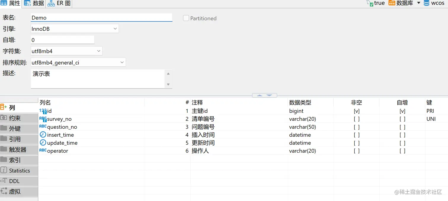 此处日期类型默认限制了长度,字符串类型统一设置成255(注意实际业务需要按具体场景设计每个字段长度,否则会造成表空间资源的浪费)