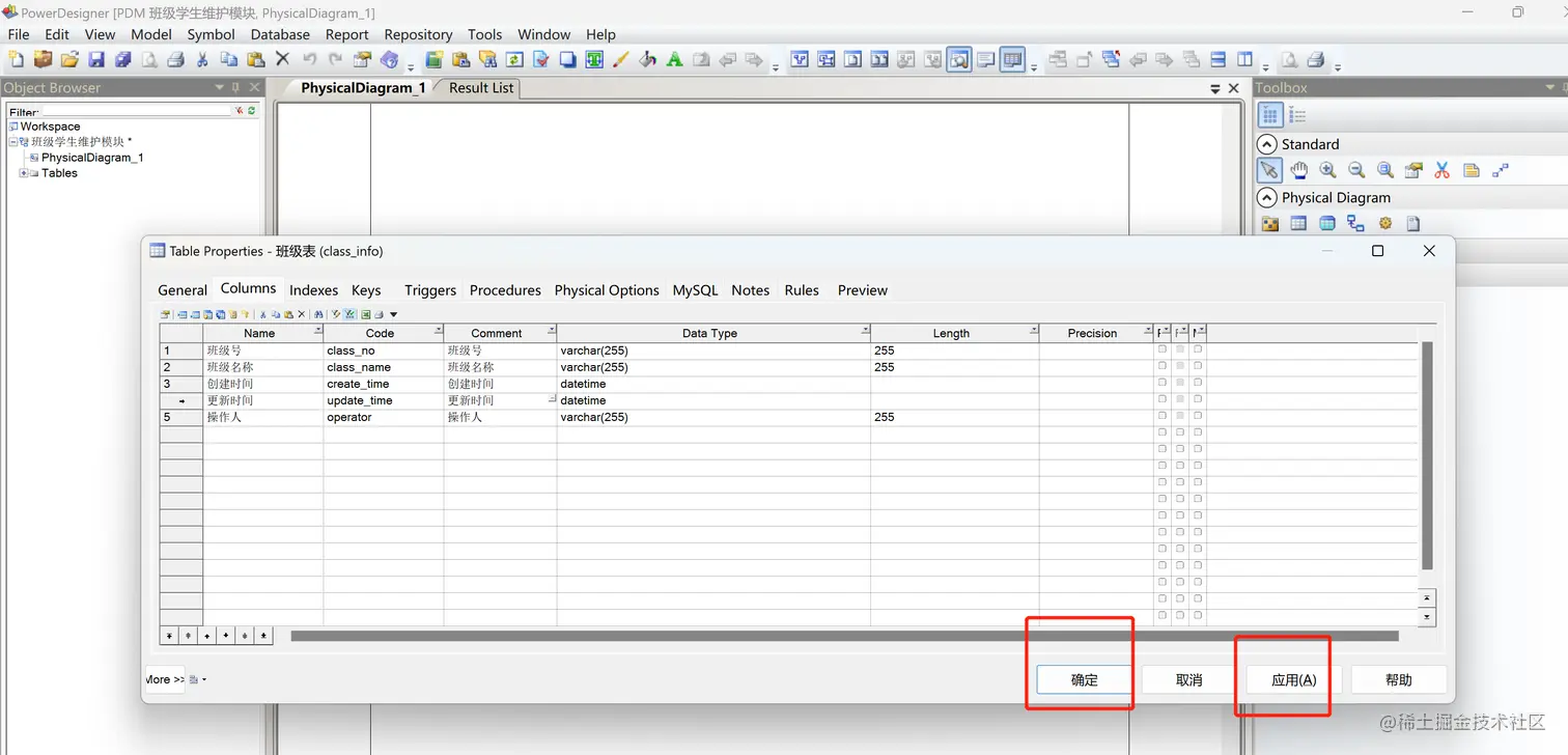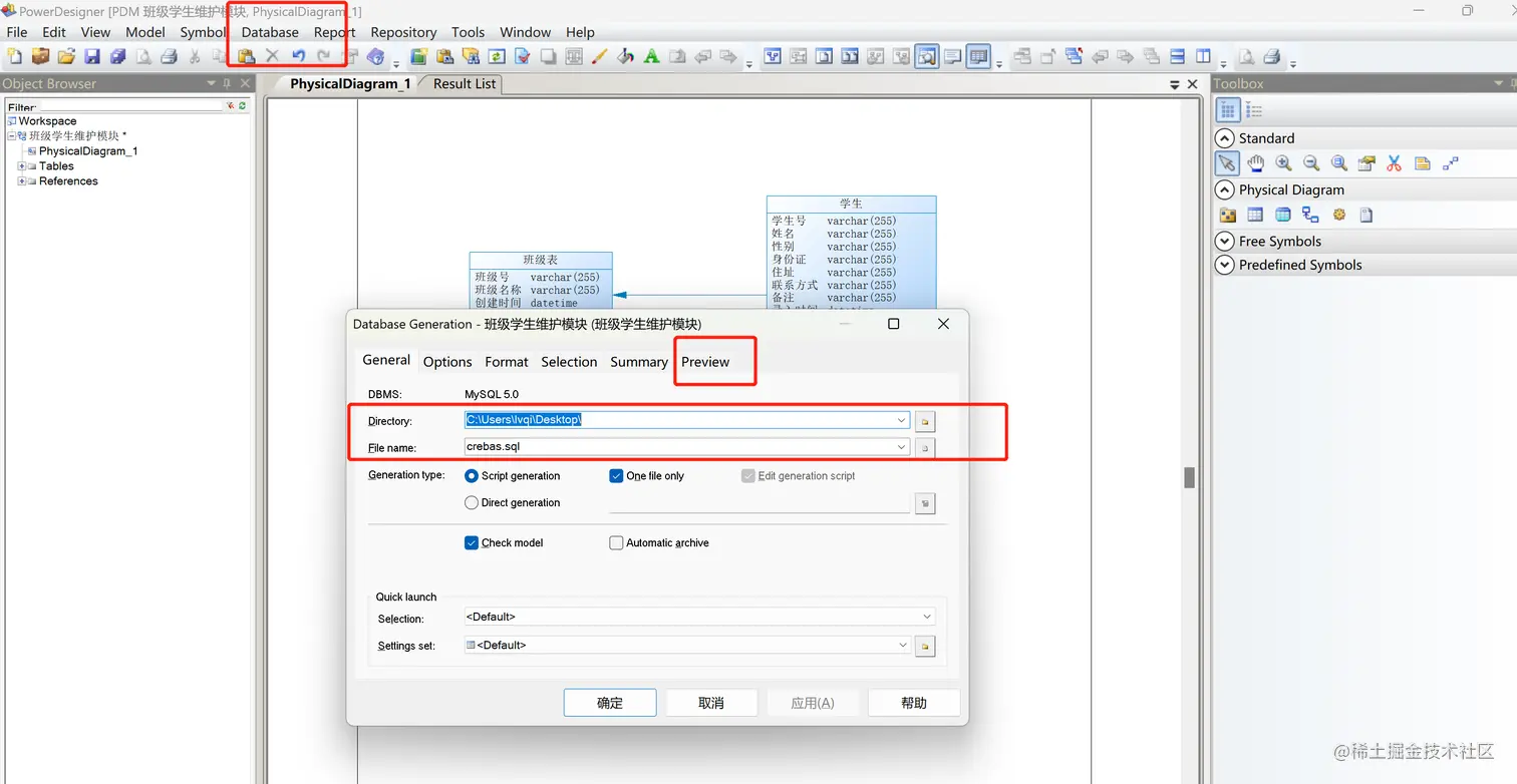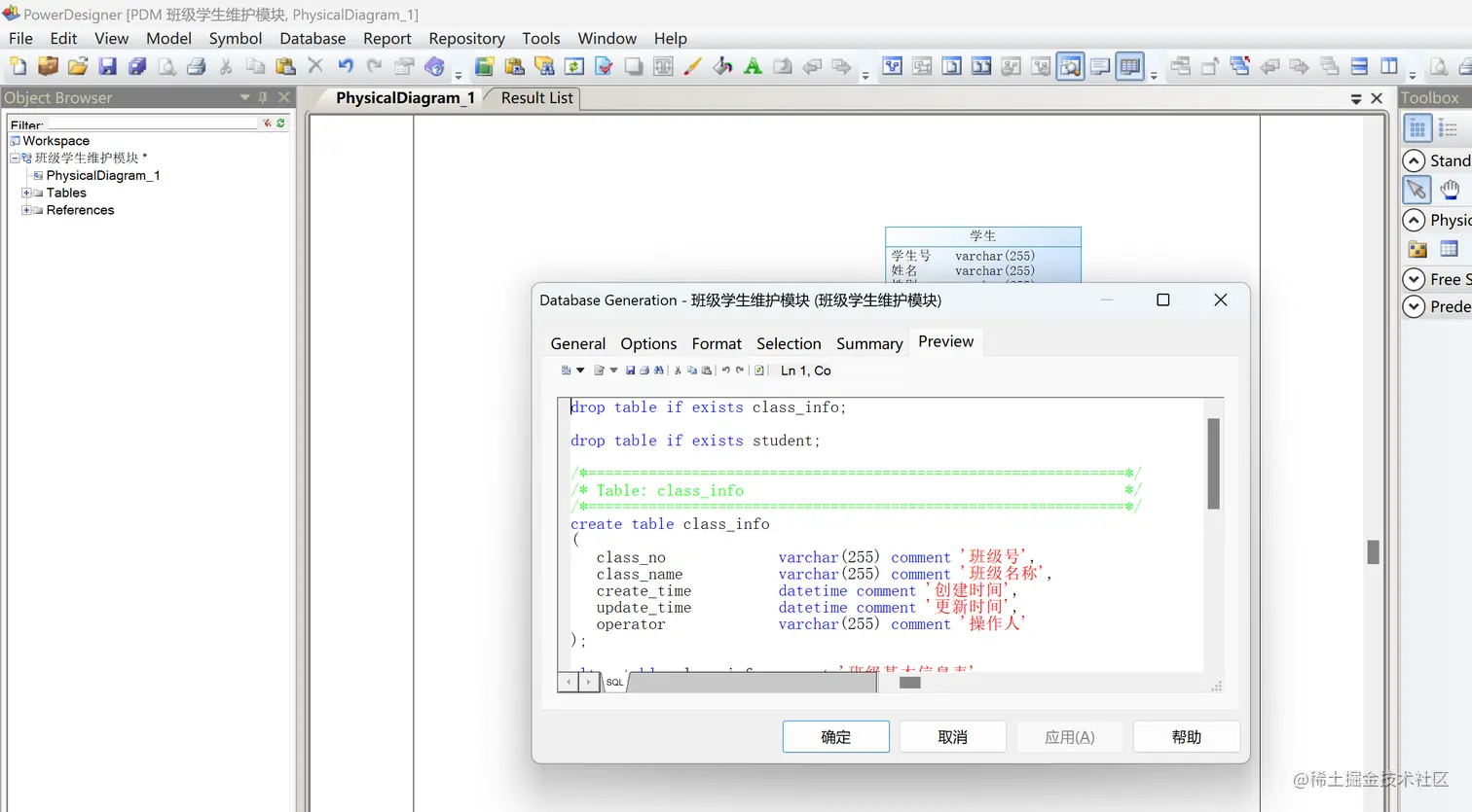 PowerDesigner就支持我们做好ER图设计之后一键导出各种数据库的SQL语句了,我们只需要将生成的SQL拷贝到数据库进行执行即可(极少量的修改)。