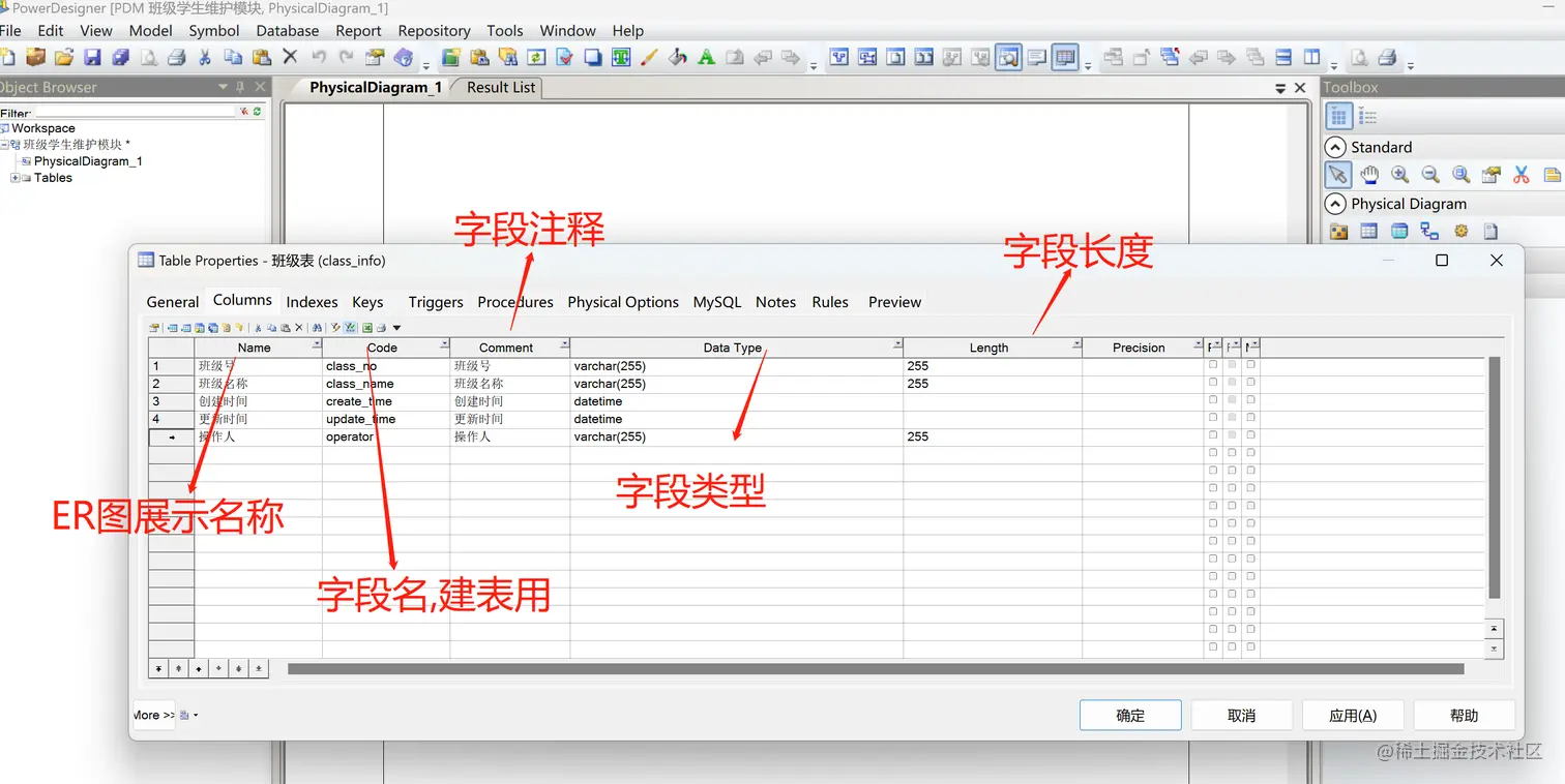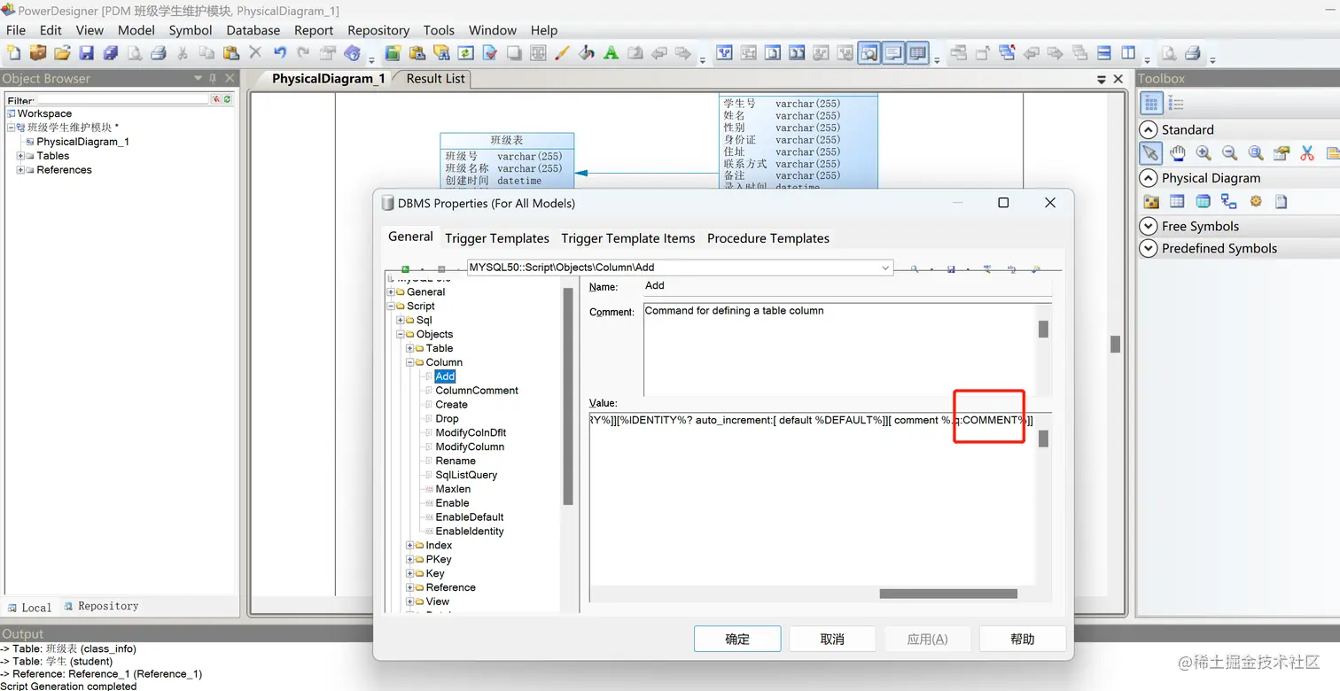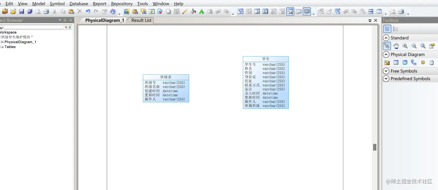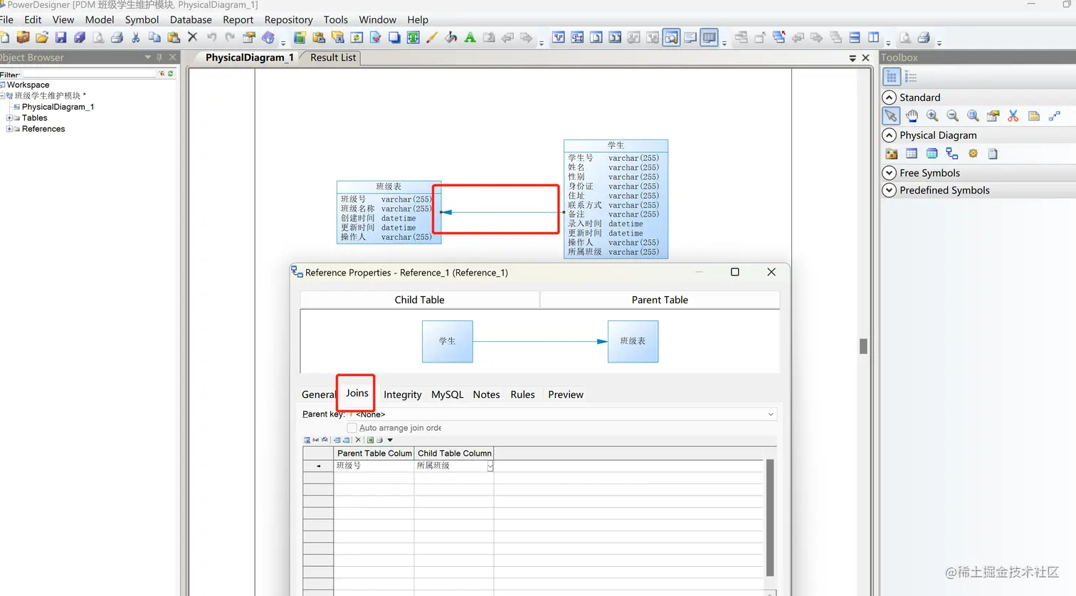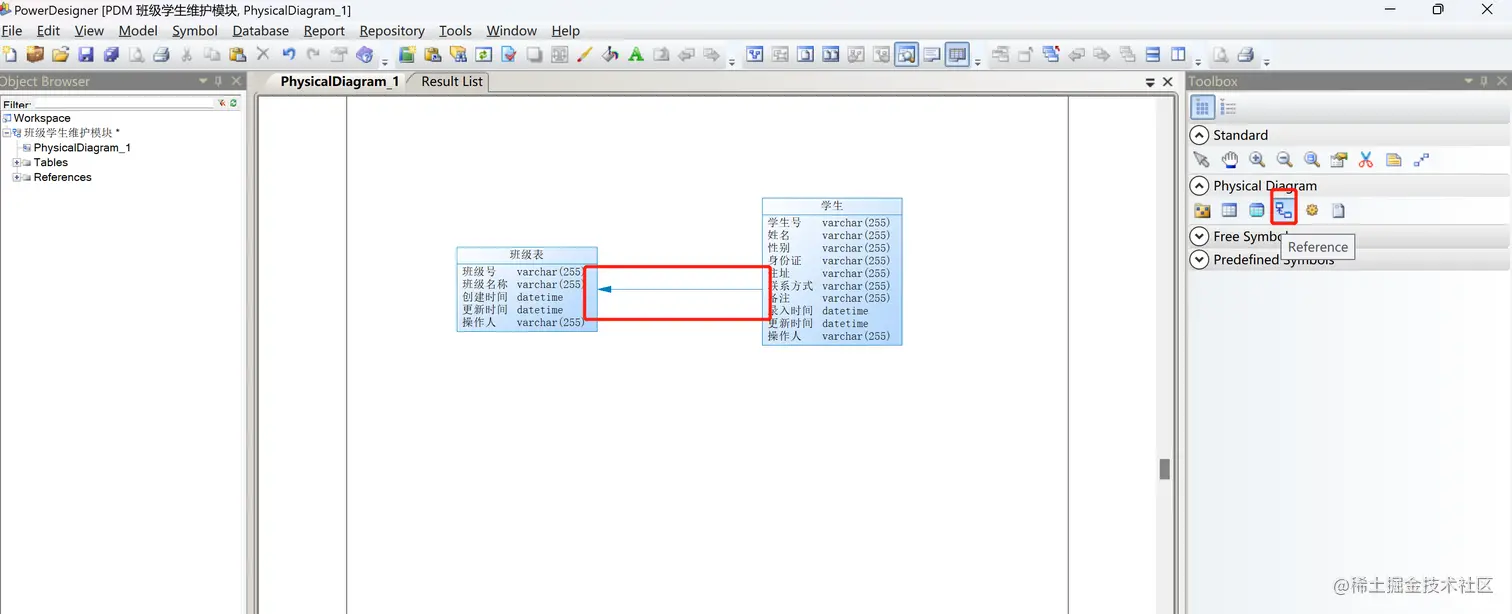 接下来选中右侧ToolBox-Pyhsical Diagram-Reference,然后对班级表和学生表进行关联