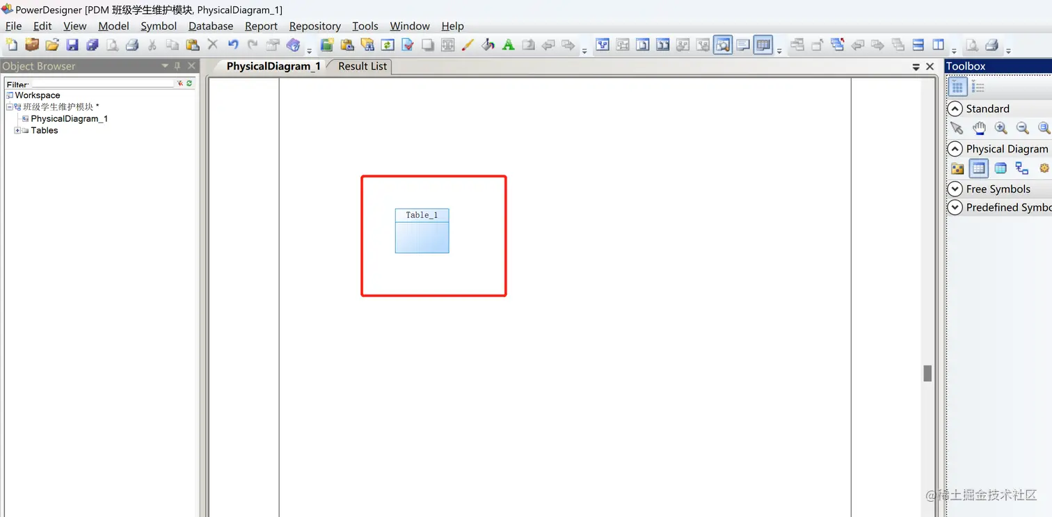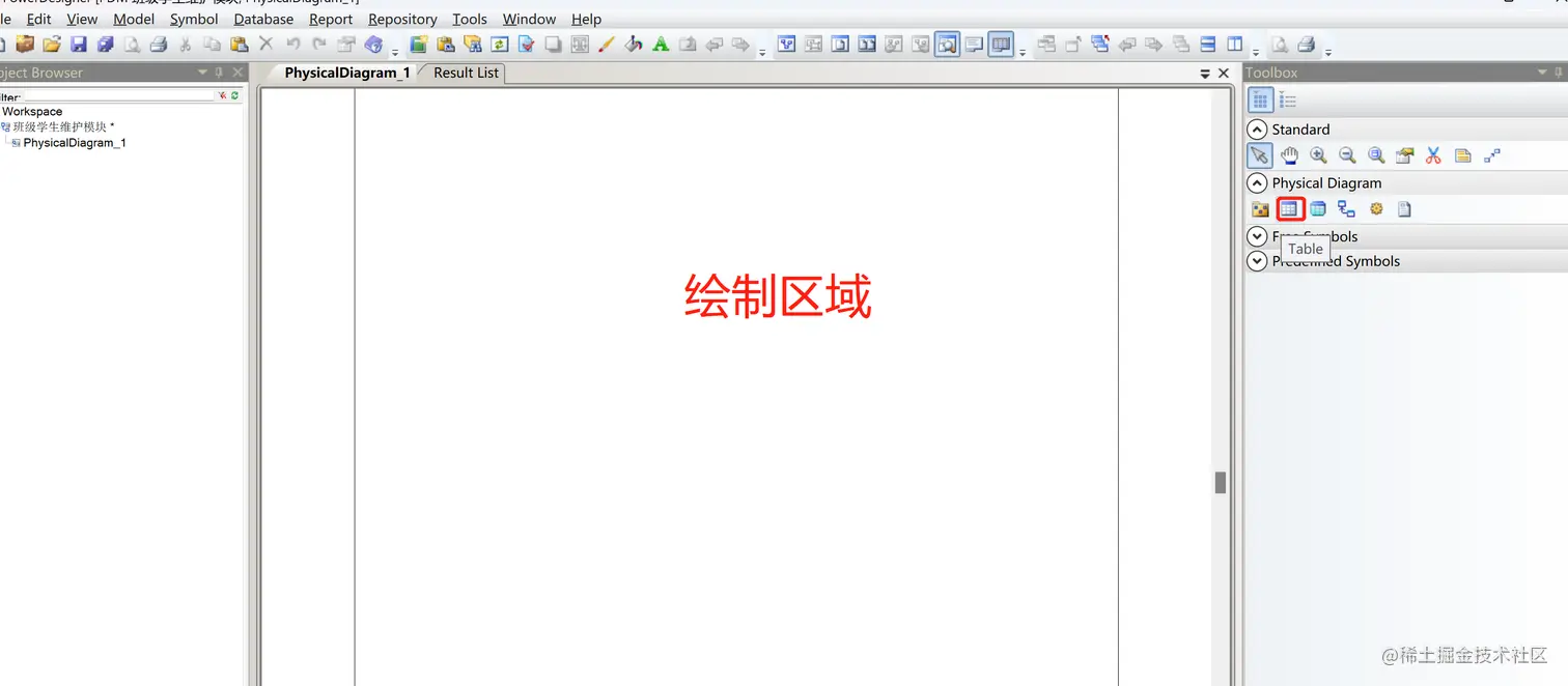 在右侧Toolbox上选中table图标,然后单击中间绘图区域添加一个表区域
