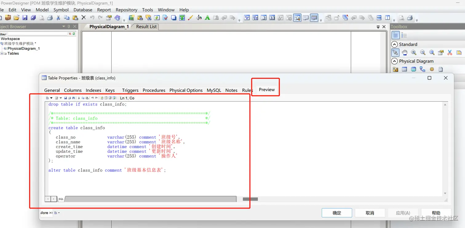 原因是因为PowerDesigner默认配置的导出不带注释,需要手动修改下导出的sql配置信息,针对mysql5.0修改方式如下: