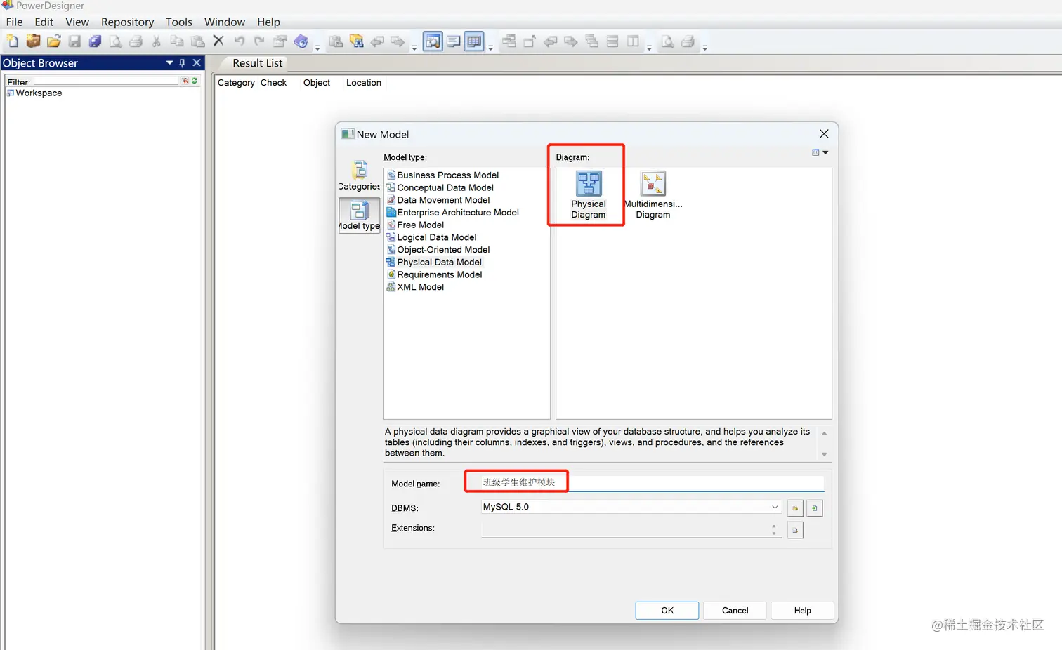 打开我们的PowerDesigner,左上角选择File-New Model,输入er图名称,点击[ok]创建空文件。