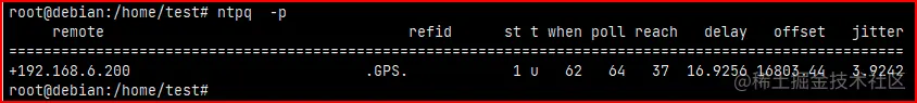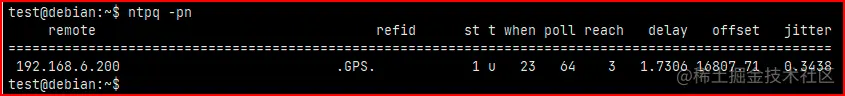 - remote - 远程 NTP 服务器的名称。如果使用 -n开关,您将看到这些服务器的 IP 地址,而不是它们的主机名。- refid - 指示每个服务器现在从何处获取时间。它可以是服务器主机名或类似 .全球定位系统。 ,表示全球定位系统源。 - st - tratum 是一个介于 1 到 16 之间的数字,表示远程服务器的精度。 1 表示最准确,16 表示“服务器无法访问”。您的层将等于精确的远程服务器加 1。切勿连接到第 1 层服务器,请使用第 2 层服务器!第 2 层服务器也适合我们的目的,此策略适用于减少第 1 层服务器的流量。 - poll 时间请求之间的轮询间隔(以秒为单位)。该值的范围介于允许的最小和最大轮询值之间。最初,该值将较小,以便快速进行同步。时钟“同步”后,轮询值将增加,以减少网络流量和常用时间服务器上的负载。 - reach 这是 8 位数组的八进制表示形式,表示本地计算机尝试到达服务器的最后 8 次。如果到达远程服务器,则设置该位。 - delay 接收“现在几点了”请求的响应所需的时间(秒)。 - offset 最重要的价值。本地服务器和远程服务器之间的时间差。在同步过程中,偏移时间降低,表明本地机器时间越来越准确。 - jitter 离散(也称为抖动)是几个连续请求/响应对之间偏移的统计方差的度量。较低的色散值优于较高的色散值。较低的色散可实现更精确的时间同步。