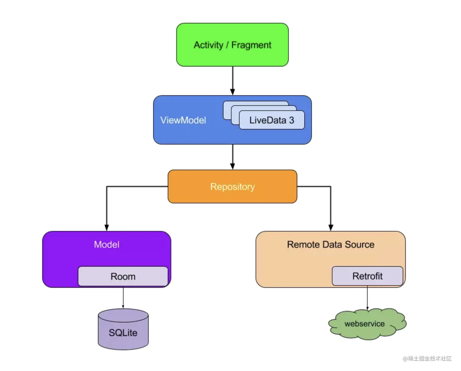 - Model-View-ViewModel,View指绿色的Activity/Fragment,主要负责界面显示,不负责任何业务逻辑和数据处理。Model指的是Repository 包含的部分,主要负责数据获取,来组本地数据库或者远程服务器。ViewModel指的是图中蓝色部分,主要负责业务逻辑和数据处理,本身不持有View层 引用,通过LiveData向View层发送数据。Repository统一了数据入口,不管来自数据库,还是服务器,统一打包给ViewModel。