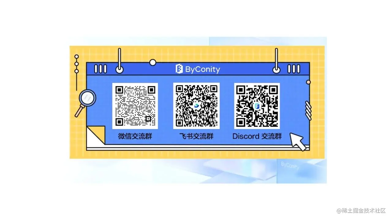 ByConity社区拥有大量的用户,同时是一个非常开放的社区,我们邀请大家和我们一起在Github上讨论共建,也可以加入我们的微信群、飞书群或者Discord参与交流。