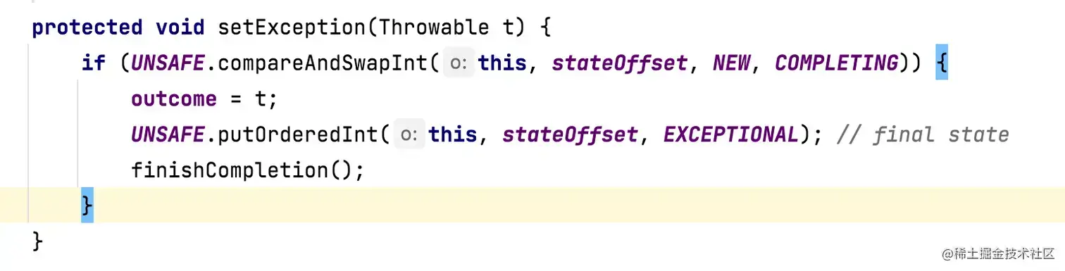 若执行时抛出异常而结束则将 outcome 设置为抛出的异常,FutureTask 状态最终更新为非正常结束‘EXCEPTIONAL’。
